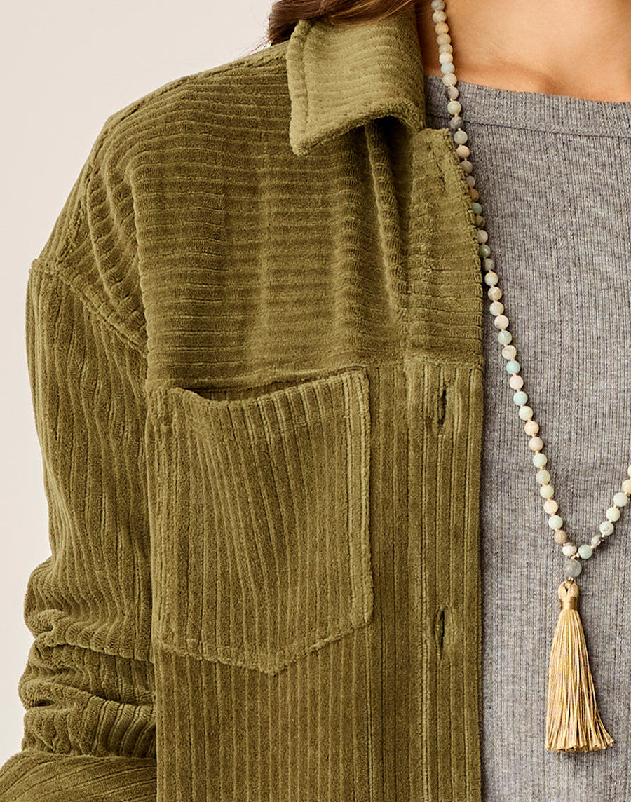 Choose your own adventure with this stretch cord shacket, sporting a shirttail hem, chest and side seam pockets as well as a button front closure. This is not our classic corduroy, but instead a slightly heavier weight, more lustrous and stretchy corduroy fabric that makes for the perfect layer.