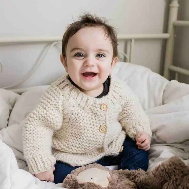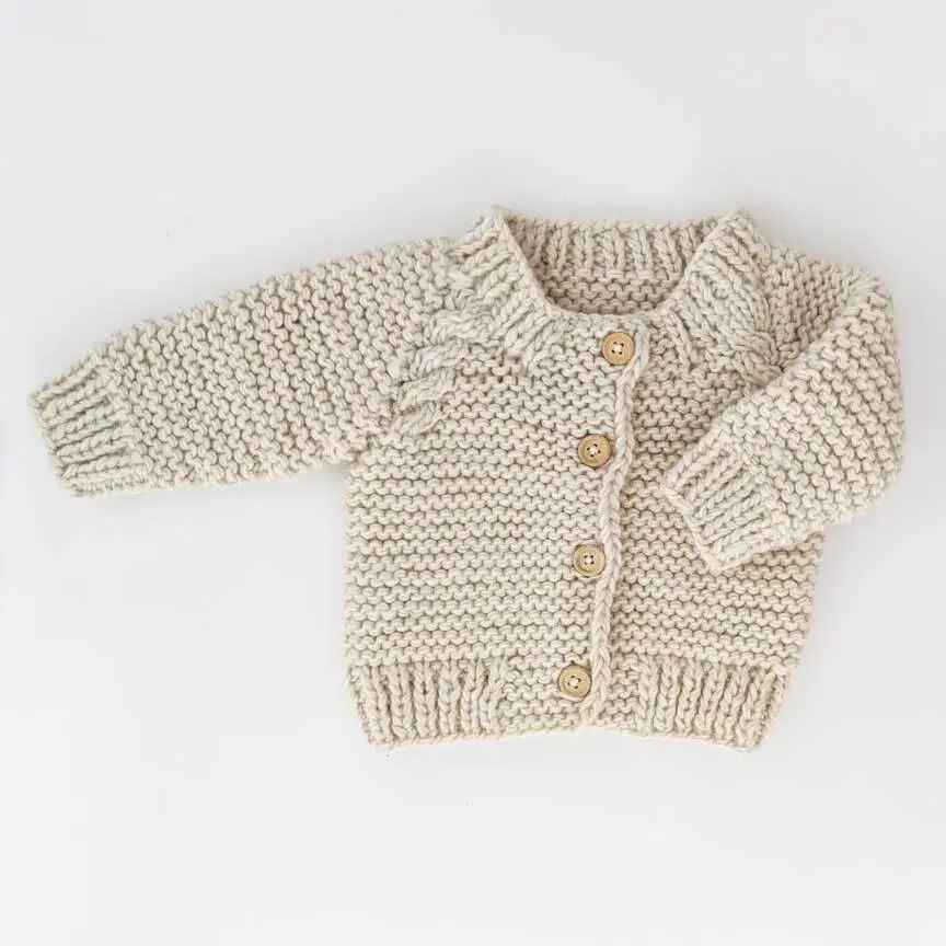 Thick, soft sweater in garter stitch has cable trim raglan sleeves and wood buttons. Hand-knit, in natural colored yarn, it is cozy and warm. What a wonderful gift for any little person you know.