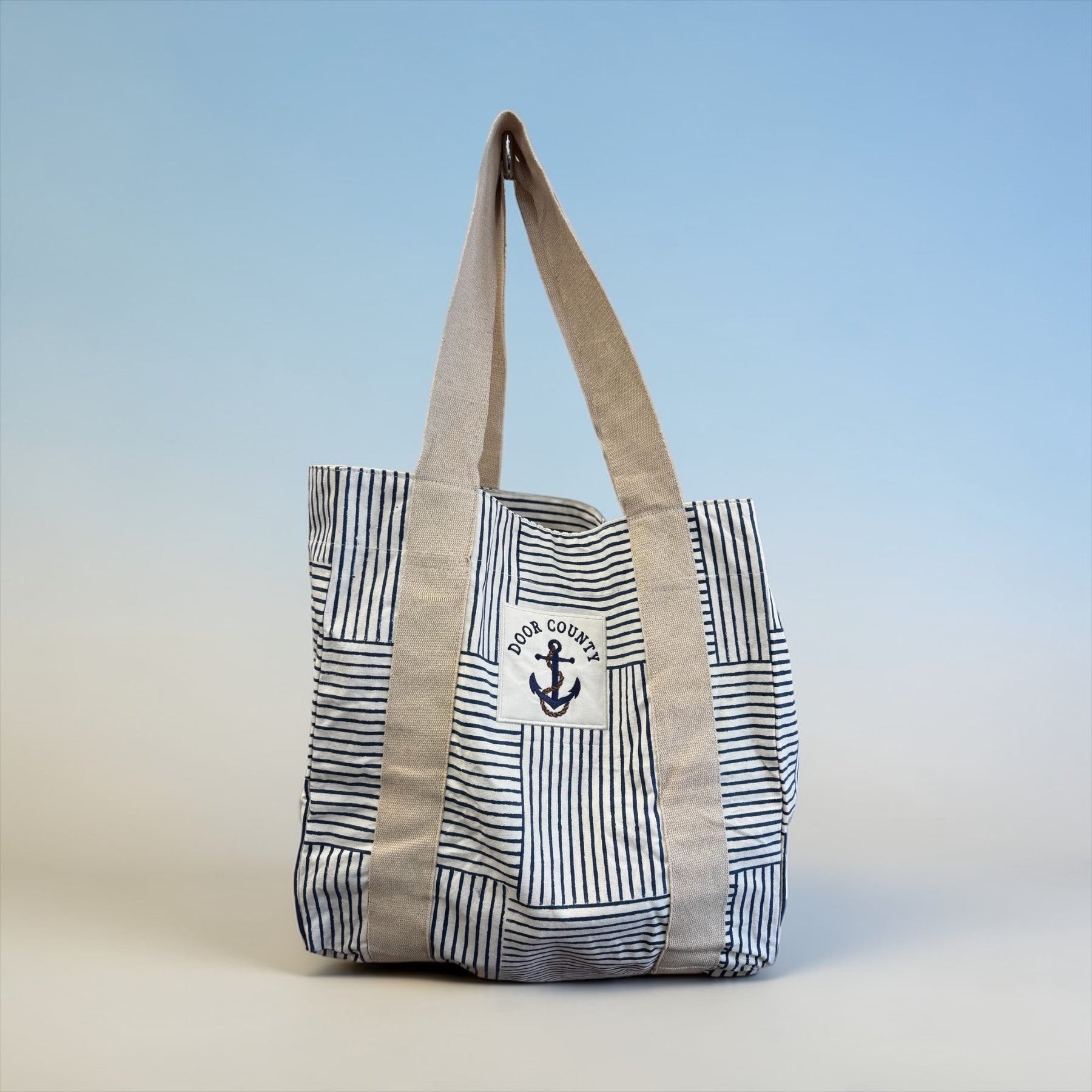 Set sail for style with the Door County Anchor & Stripes Tote Bag! This 100% cotton beauty, adorned with white and navy stripes and a fun anchor embroidery, is your go-to for beach days or grocery runs (because even a tote deserves to have fun!). It's 18” x 15” x 7”, ready to hold all your treasures—nautical vibes included!