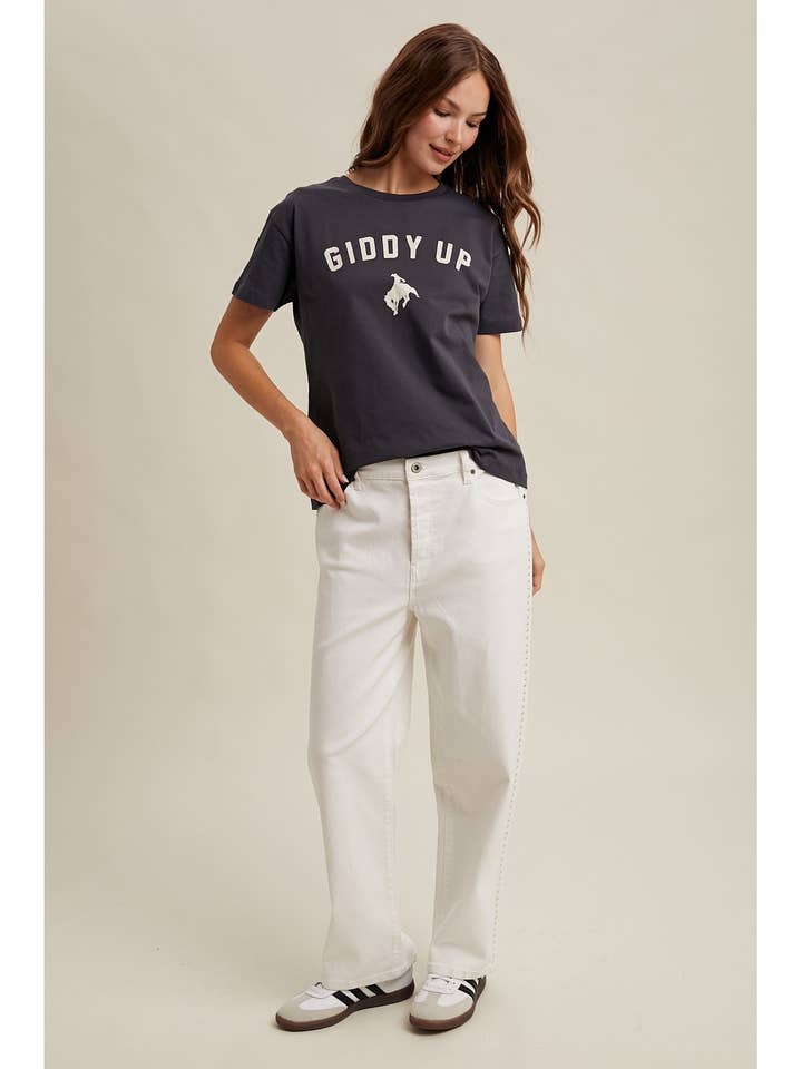 Saddle up in style with the 'Giddy Up' T-shirt, designed with fun graphic lettering and cowboy icon on a super-soft fabric for a laid-back, cowgirl vibe.