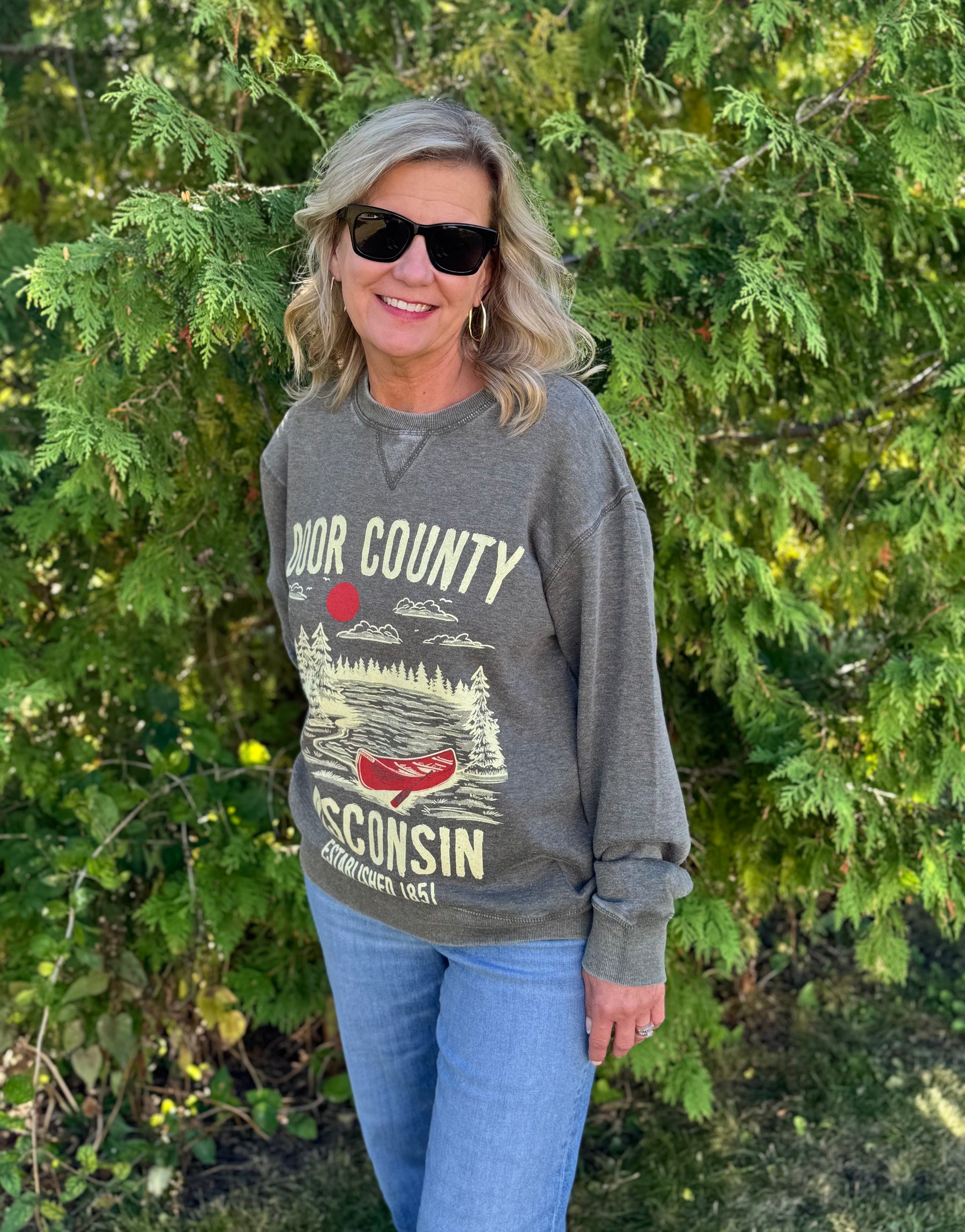 Celebrate the spirit of Door County with this retro burnout crew sweatshirt! Featuring soft fabric and a comfy unisex fit, it’s perfect for embracing memories of water, trees, sunsets, and outdoor fun. Wear a cozy reminder of Door County's outdoor beauty wherever you go.