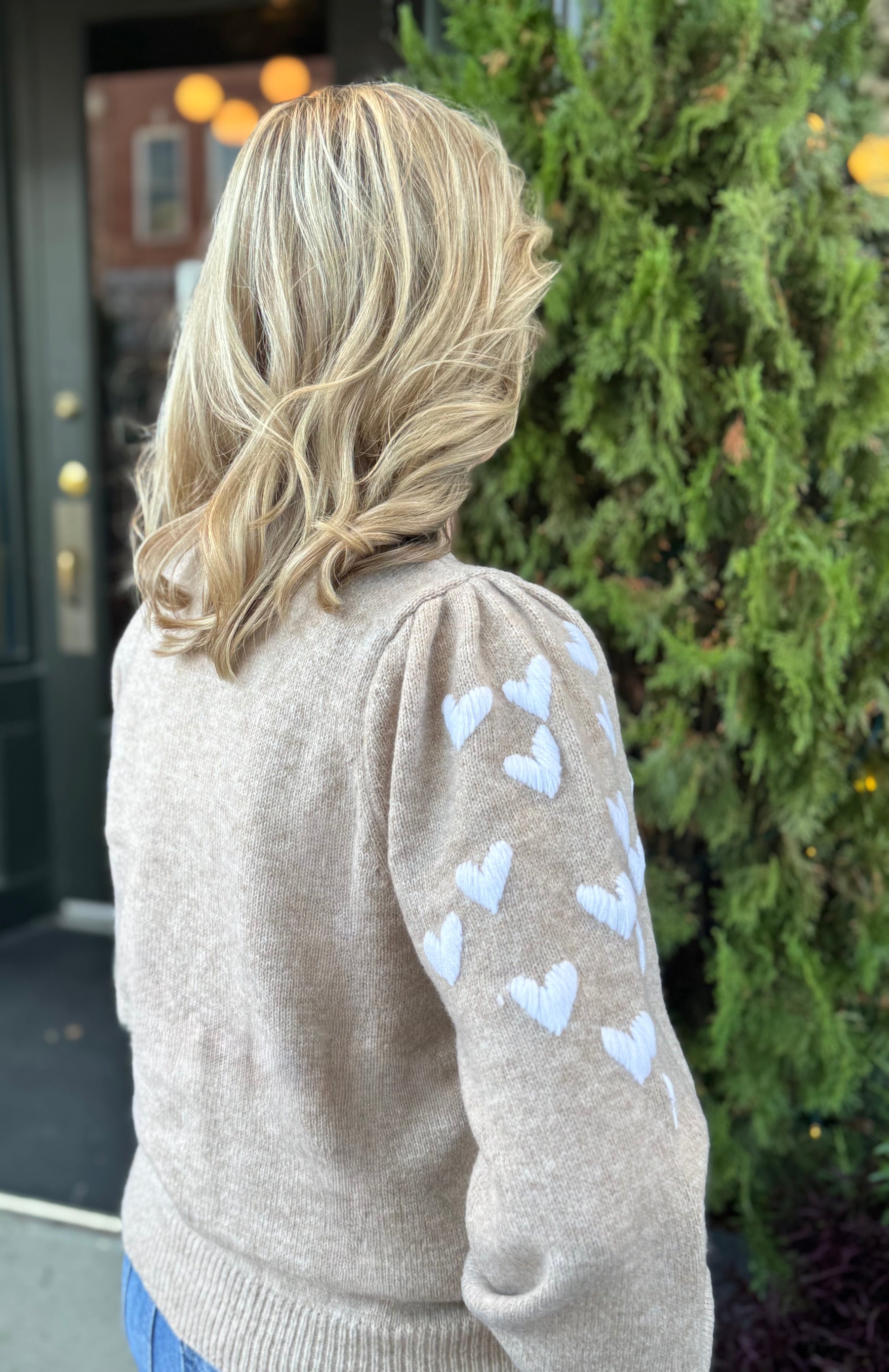 Cozy up in the Beige Rovello Sweater, featuring winter white embroidered hearts that add a charming touch to the slightly puffed sleeves. Made from a luxuriously soft knit blend with recycled polyester, this relaxed-fit crew neck sweater combines comfort and style effortlessly. Perfect for adding a playful flair to your chilly days!
