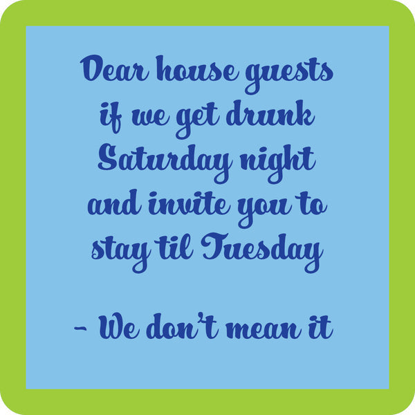 "Dear house guests if we get drunk Saturday night and invite you to stay til Tuesday