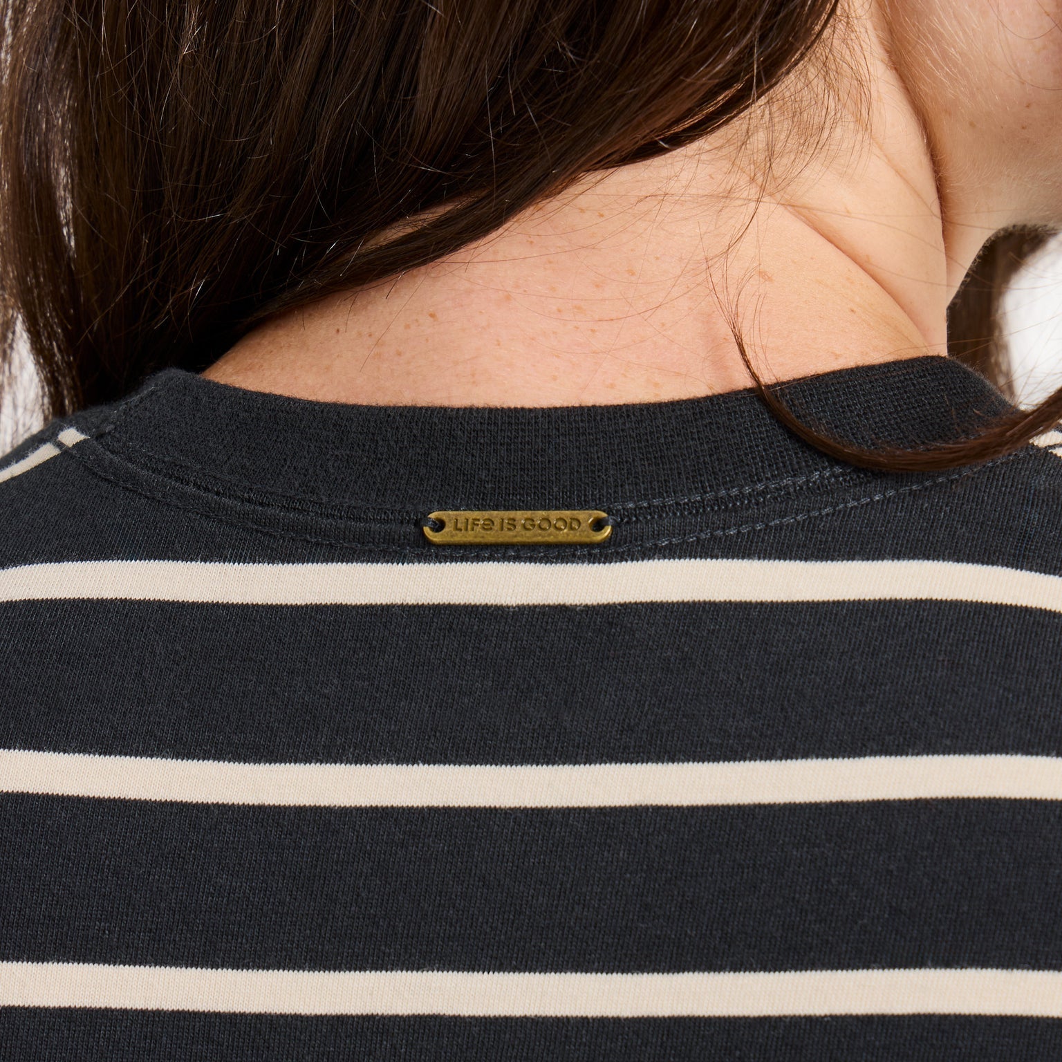 - Antiqued Brass Life is Good® tag at back neck exterior. Size medium is 47" long from high point of shoulder to hem.