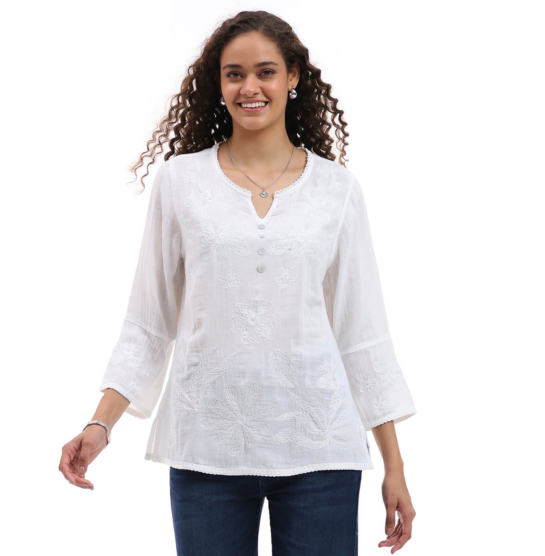 Effortless elegance meets everyday comfort in this pearl white tunic top. The flattering split V-neckline and three-quarter sleeves create a refined silhouette, while delicate all-over embroidery adds understated luxury. lined for a smooth drape, this slight tunic-length piece transitions seamlessly from season to season. A Parsley & Sage classic—the summer essential that works year-round.