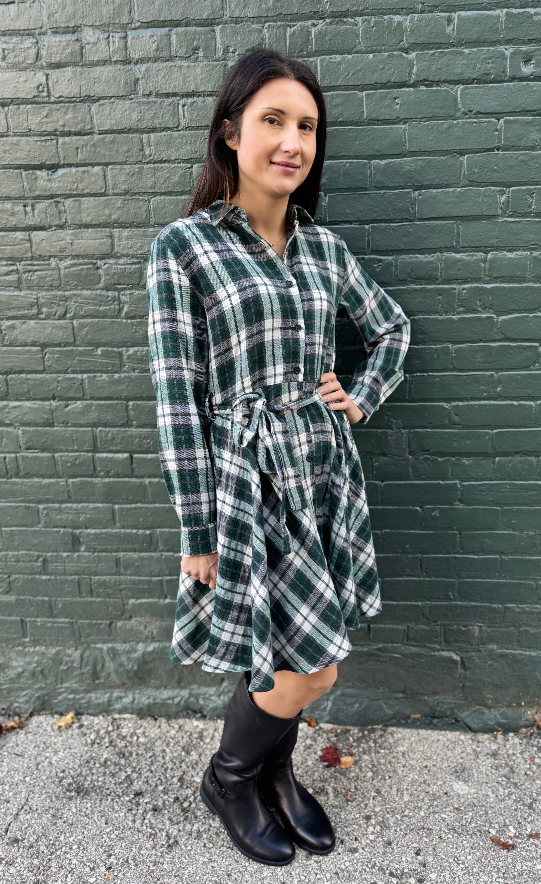 Meet your new go-to dress! The Cassie Evergreen Plaid Flare Shirt Dress combines timeless plaid charm with a playful, modern twist. Designed with a soft, flattering silhouette that skims in all the right places, this dress features a removable tie belt so you can switch up your look whenever the mood strikes. The flared cut adds movement and personality to your everyday style. Slip on your favorite tall boots and you're ready to make an entrance. Versatile, comfortable, and undeniably fabulous.