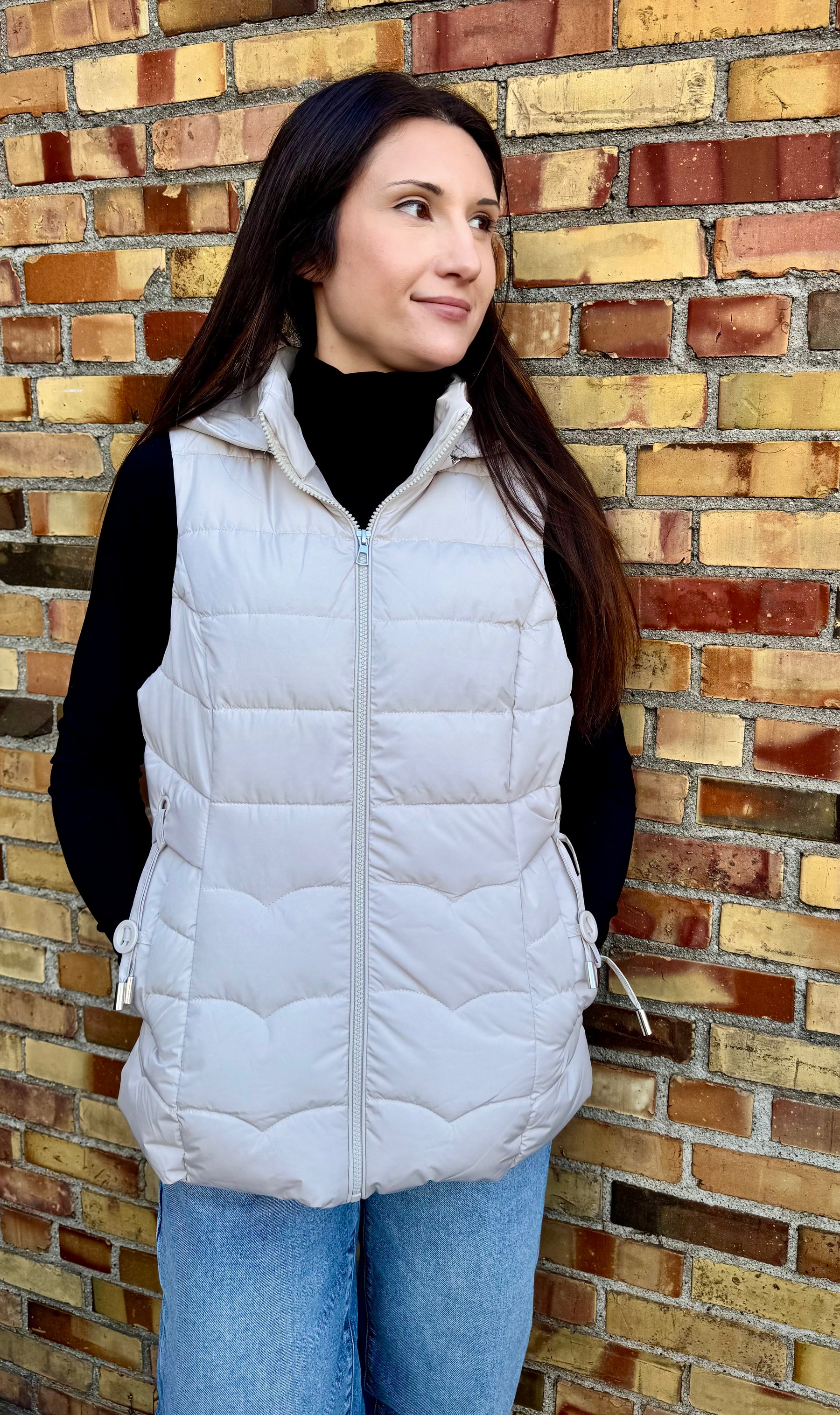 Layer up with the Maxine Putty Hoodie Puffer Vest—your new go-to for effortless cool-girl style. This season's must-have combines a cozy lined construction with a hood for extra warmth when you need it. The classic silhouette gets a fun twist with a novelty button tab pocket detail that adds personality to every outfit. Perfect for those in-between temperatures when you want comfort without the bulk.