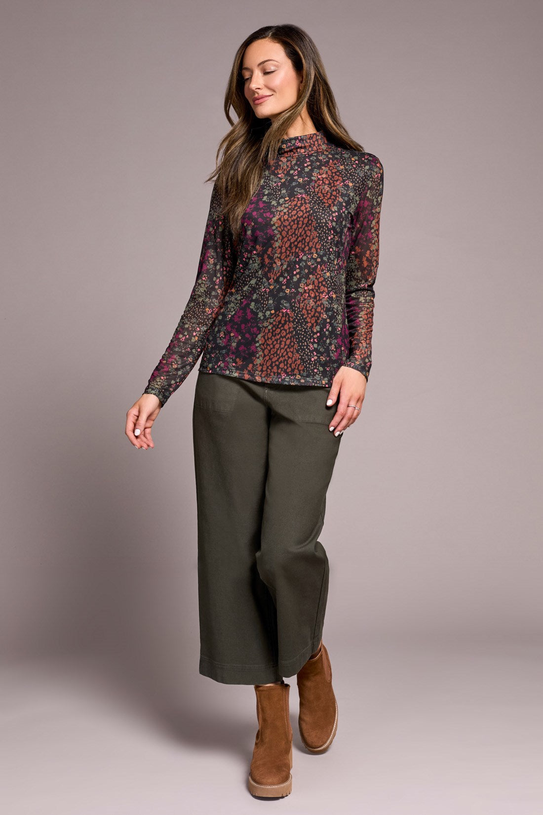Wrap yourself in chic comfort with this turtleneck top, expertly crafted from breathable mesh fabric that offers ample stretch and adorned with a vibrant print. Embracing a long-sleeve design, it ensures both style and practicality with a lined body for opaque coverage and a straight-cut hem, delivering a polished finish to any ensemble.